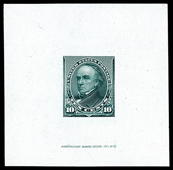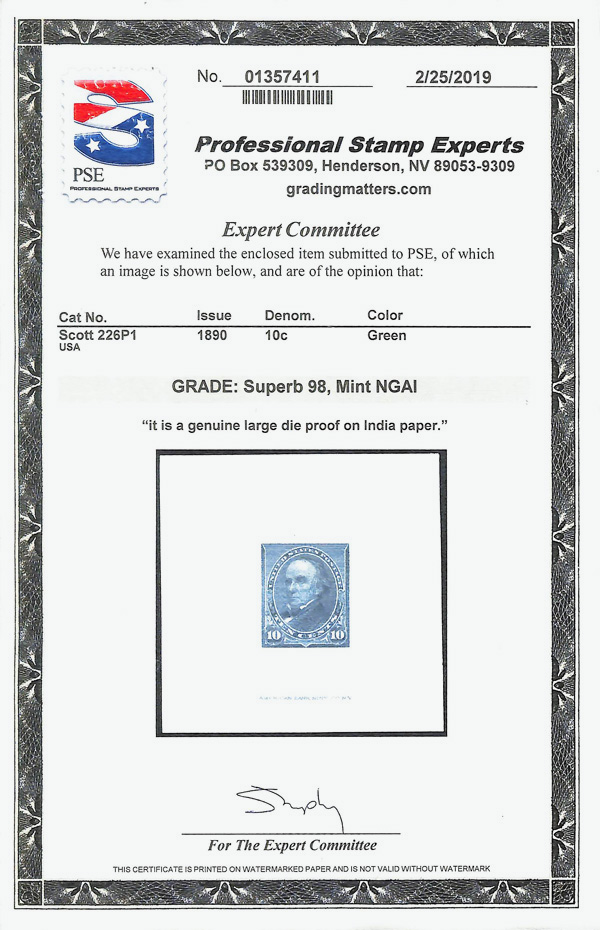 7022 P 226P1 image1890, 10¢ green, large die proof on India paper (Scott 226P1), remarkably clean example of india without card backing, the SMQ does not currently price this proof, without gum as issued, Superb, with 2019 P.S.E. certificate graded SUP 98.