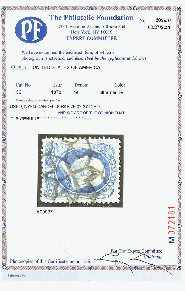 7012 O 156 image1873, 1¢ ultramarine, C.B.N.C. printing (Scott 156), New York Foreign Mail cancel. Kirke 75-02-27-IGEO., Very Fine to Extremely Fine. (Image) (Image2) (All Images)