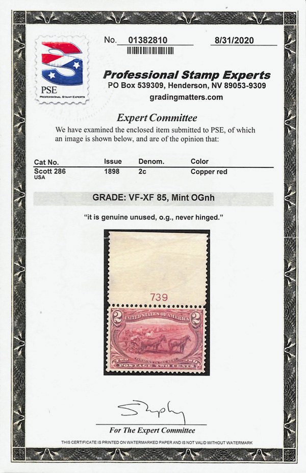 7032 nh 286 image1898, 2¢ Trans-Miss. (Scott 286), perfectly framed margins, o.g., never hinged, Very Fine to Extremely Fine, with 2020 P.S.E. certificate graded VF-XF 85.