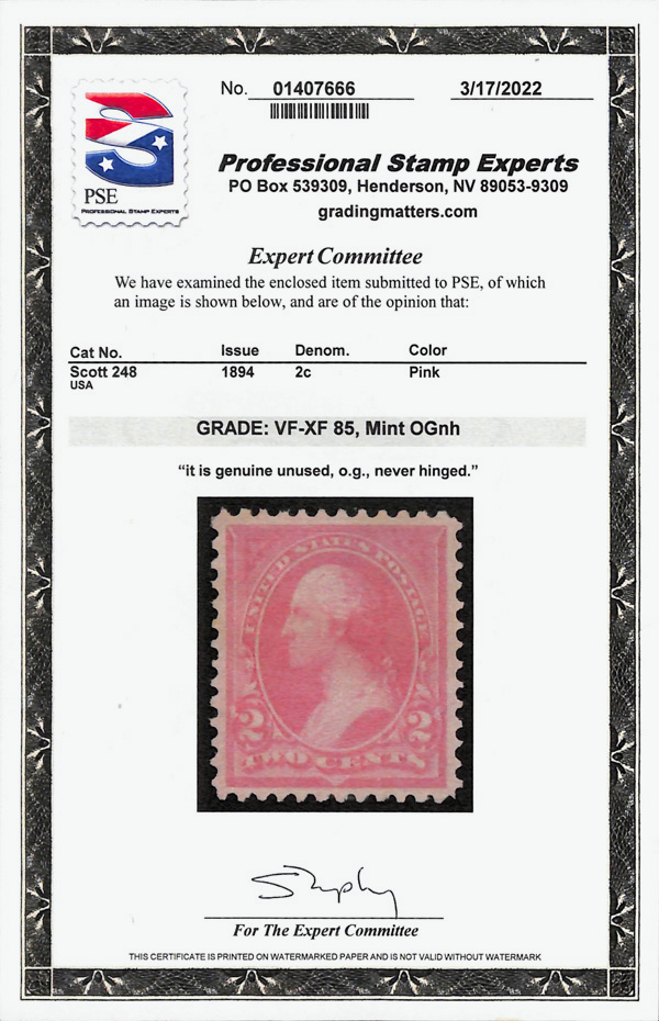 7030 nh 248 image1894, 2¢ pink, type I, unwatermarked (Scott 248), bold and clear lines, o.g., never hinged, Very Fine to Extremely Fine, with 2022 P.S.E. certificate graded VF-XF 85.