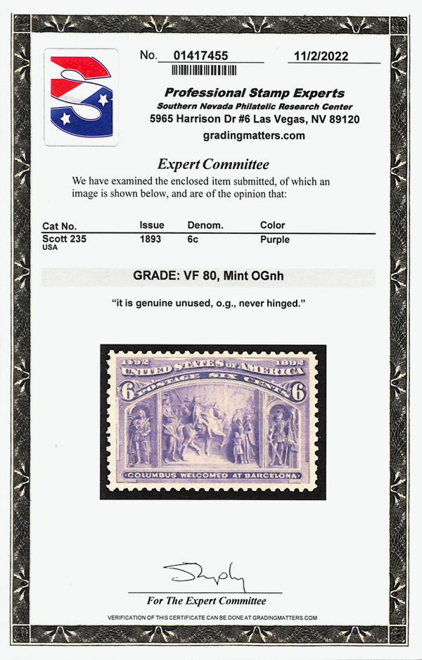 7028 nh 235 image1893, 6¢ Columbian (Scott 235), pristine, radiant quality, o.g., never hinged, Very Fine, with 2022 P.S.E. certificate graded VF 80.