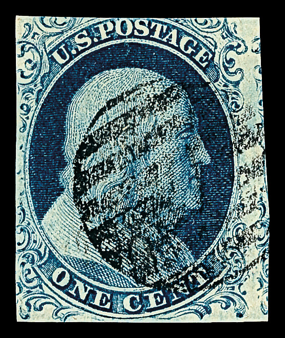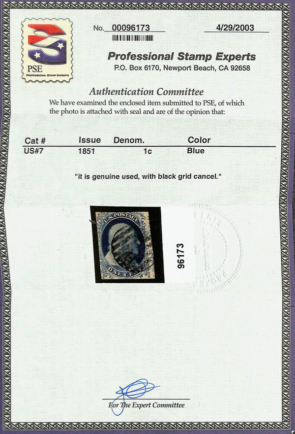 7001 O 7 image1851, 1¢ blue, type II (Scott 7), Post Office fresh with intense color on bright white paper, sound with black circular grid cancel and right margin capturing portion of adjacent stamp, Very Fine, with 2003 P.S.E. certificate.