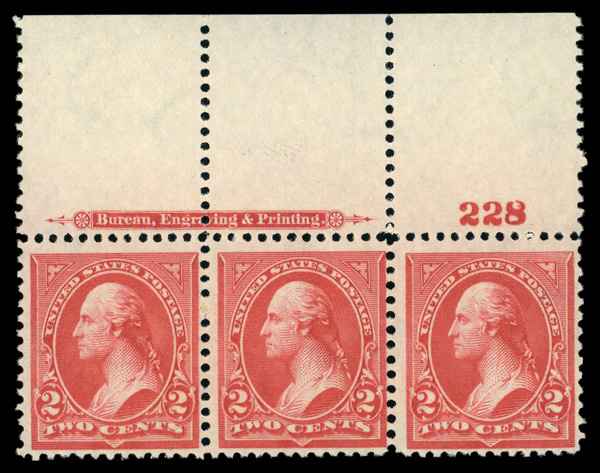 7031 nh 267 image1895, 2¢ carmine, type III, D.L. watermark (Scott 267), plate number strip of 3, o.g., never hinged, Fine to Very Fine.