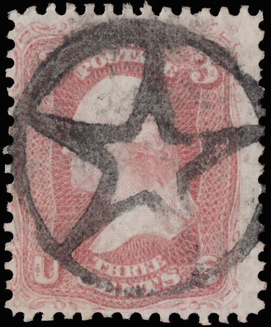 Star & Crescent of Nebraska City, Neb., excellent, complete strike on a Fine 3¢ rose (65). (Image)