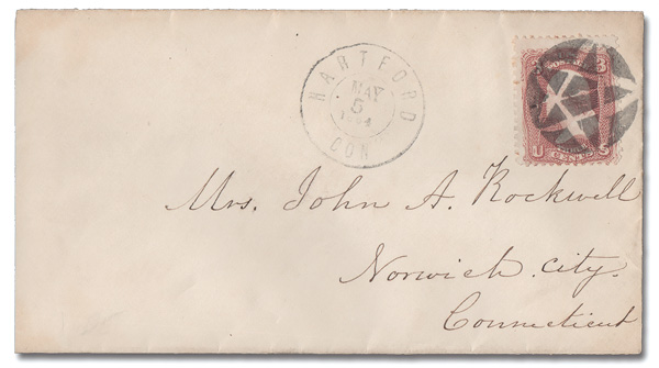 cancel ties a 3¢ rose (65) on a small, clea cover to Norwich City, Ct. with a lt Hartford c.d.s., May 5, 1864. (Image) (Image2)