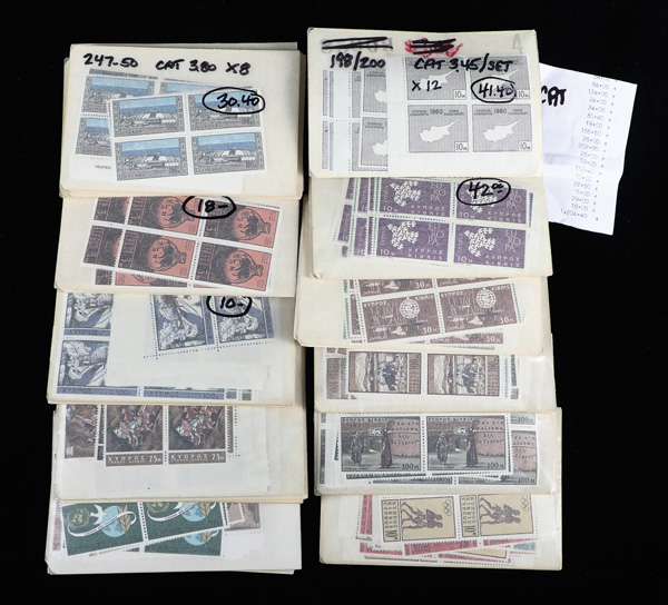 7463   imageCyprus, Mint Sets and Blocks, 1960-69, about 30 glassine envelopes with fresh sets offering mild to moderate duplication; includes #198-200, 201-203, 204-205, 222-223, 224-226, 227-228, 232-236, 237-240, 241-243, 247-250, 254-256, 257-259, 260-261, 262-264, 265-268, 278-288, 304-307, 311-312, 314-16, 332-334, 346-348, and more, Fine to Very Fine. Shipping charges apply - weight 1 lbs. (PDF for this Lot) (Image) Suggested Bid $34