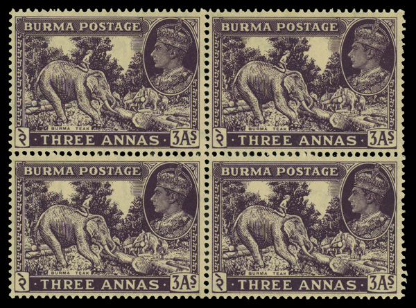 7462 nhbl 26 image1938-40, 3a dark purple Elephant Moving Teak Log (Scott 26), block of 4, o.g., never hinged, Fine to Very Fine.
