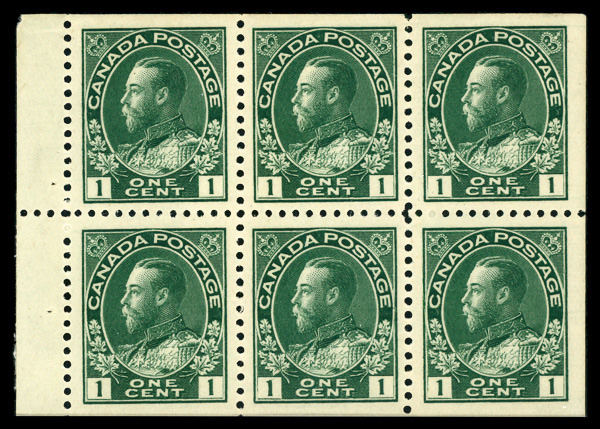 7510 BKnh 104a image1912, King George V "Admiral", 1¢ blue green, booklet pane of 6 (Scott 104a), P.O. fresh with exceptional centering, o.g., never hinged, Extremely Fine.