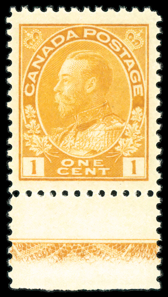 7511 nh 105 image1922, King George V "Admiral", 1¢ yellow, wet printing, type I (Scott 105), bottom margin single with type C lathework, wonderfully well-centered with bright color, unblemished o.g., never hinged, Very Fine and choice.