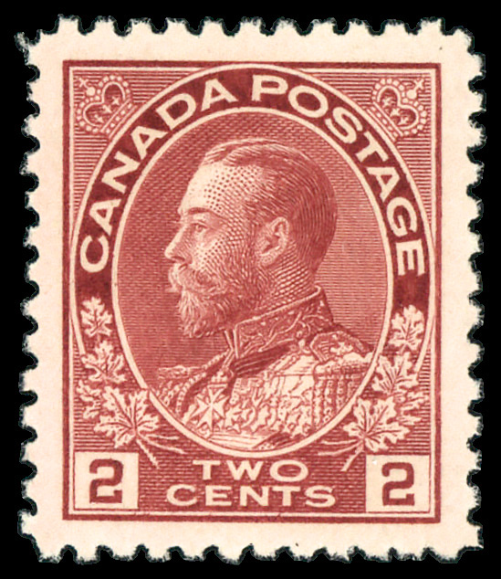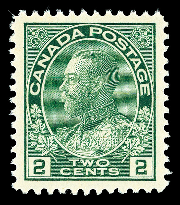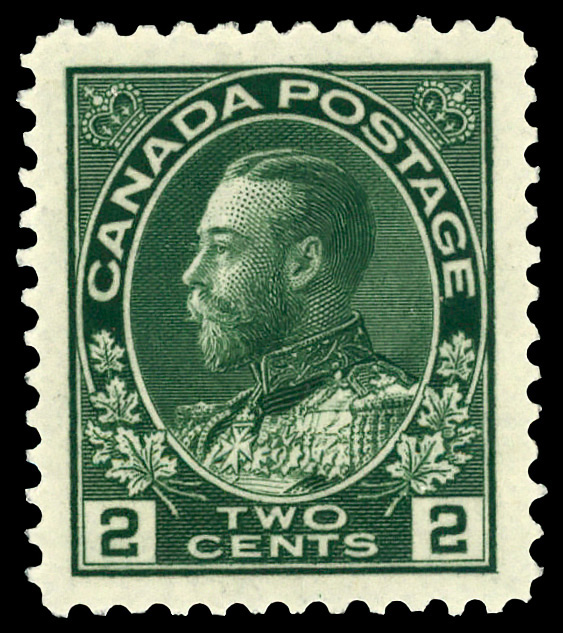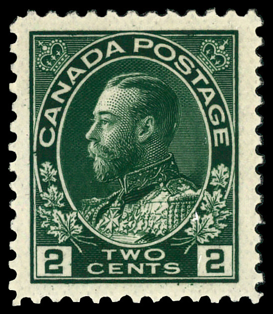 7520 nh 107i image1922, King George V "Admiral", 2¢ deep green, wet printing (Unitrade 107i), marvelously well-centered amidst large balanced margins, rich characteristic color, o.g., never hinged, Extremely Fine, a real gem for the perfectionist.