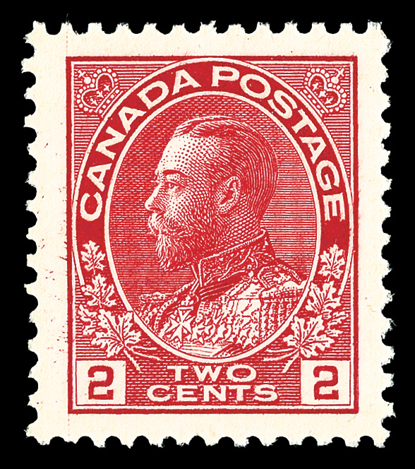 7515 nh 106c image1912, King George V "Admiral", 2¢ rose carmine (Scott 106c), mathematically precise centering within large balanced margins, fresh color, o.g., never hinged, Extremely Fine and choice, a real gem.