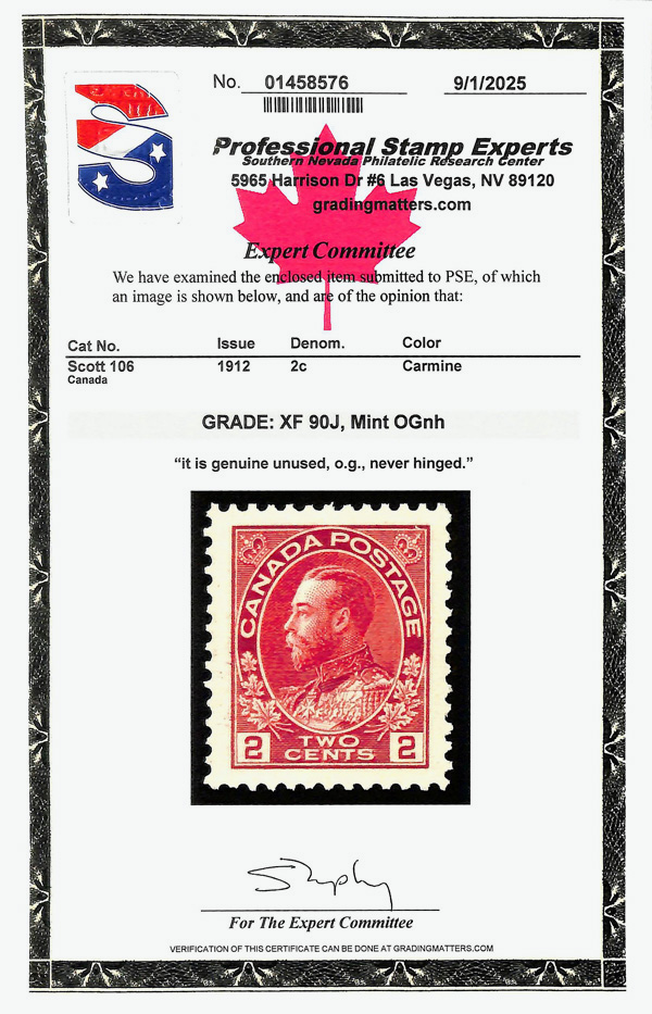 7516 nh 106iii image1912, King George V "Admiral", 2¢ dark carmine (Unitrade 106iii), bold rich color and outstanding centering within large margins, o.g., never hinged, Extremely Fine and choice, with 2025 P.S.E. certificate graded XF 90J.