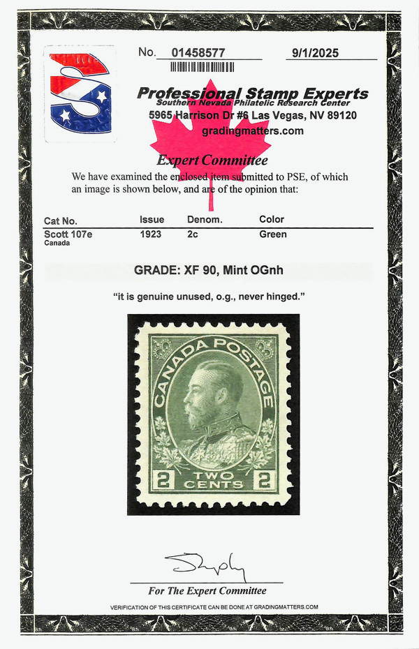 7518 nh 107e image1923, King George V "Admiral", 2¢ green, dry printing (Scott 107e), exceptional single combining precise centering, large margins and rich color, o.g., never hinged, pinpoint natural inclusion, Extremely Fine, with 2025 P.S.E. certificate graded XF 90.