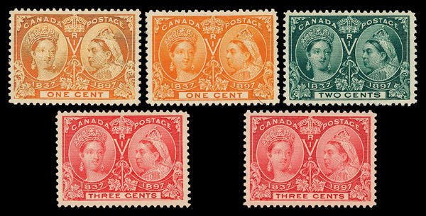 7499 nh/og 51/54 image1897 Jubilee Issue Premium Assortment (Scott 51/54), comprised of six mint singles chosen for freshness of color and excellent centering, with 51 (2 including one NH), 52 NH, 53 (2 including one NH with oversized margins), 54, Very Fine or better, premium selection of these popular issues.