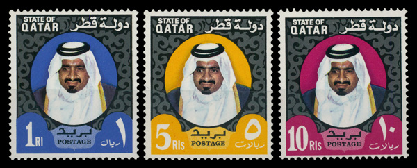 7489 nh 360A-360C image1973-1974 Sheik Khalifa bin Hamad al Thani high values (Scott 360A-360C), singles, o.g., never hinged, Fine to Very Fine.