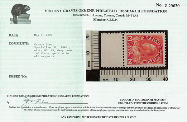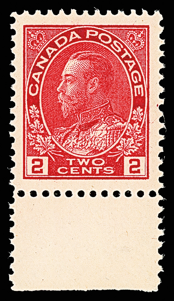 7513 nh 106 image1912, King George V "Admiral", 2¢ deep rose red (Scott 106e), bottom margin single, o.g., never hinged, a stellar example with bright color, sharp detail, and massive, balanced margins, Extremely Fine, with 2022 Greene Foundation certificate.