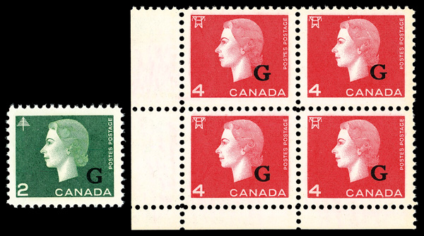 7602 nh O47i, O48i imageOfficials, 1963, 2¢ green and 4¢ carmine Queen Elizabeth II, "blunt G" varieties (Unitrade O47i, O48i), pristine, the 2¢ a single, the 4¢ position 91 in corner margin block of four, each with bar of "G" truncated; nice additions to your Canadian Officials collection, o.g., never hinged, Very Fine or better.