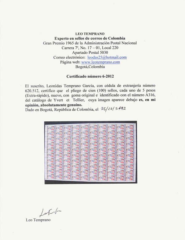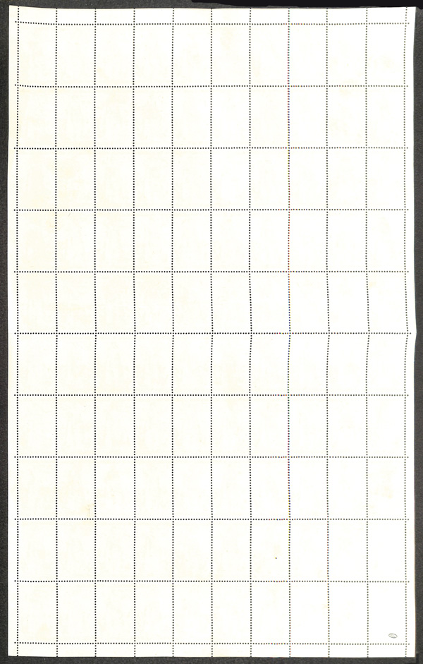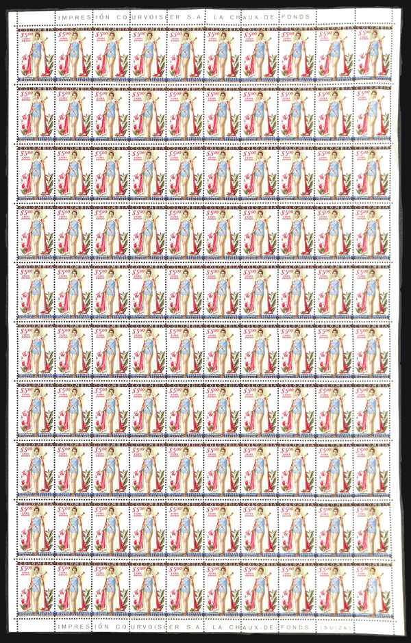 7612 nhbl C318 image1959, 5p Miss Universe Air Post (Scott C318), complete sheet of 100, o.g., never hinged, gorgeous colors on exceptionally bright white paper; folded along center horizontal row of perfs and 3 light creases affecting 12 stamps, still an Extremely Fine and a very high catalog value sheet, signed Temprano on bottom left stamp, with 2012 Temprano certificate.