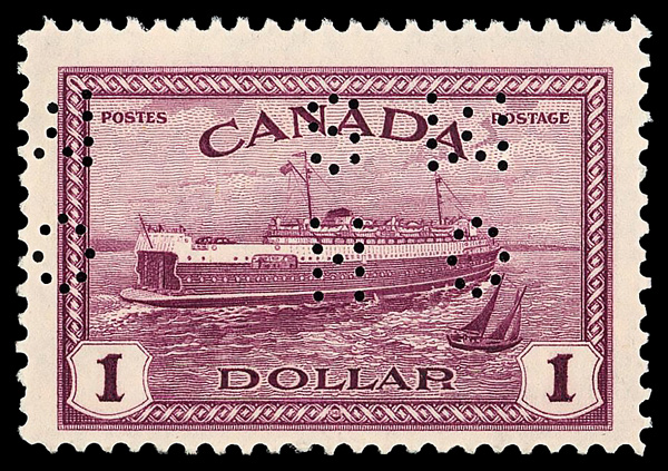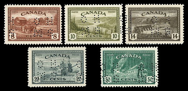 7603 nh O268-73 imageOfficial Perfin, 1946, King George VI "Peace" definitives, 8¢ to $1 complete, "O.H.M.S." perfin, "H" 4 holes in vertical bars (Scott O268-73), fresh colors, o.g., never hinged, fine to very fine.