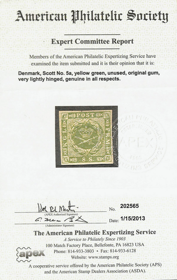 7615 og 5a image1857, Royal Emblems, 8sk yellow green (Scott 5a), o.g., very lightly hinged, Very Fine to Extremely Fine, with 2013 A.P.E.X. certificate.