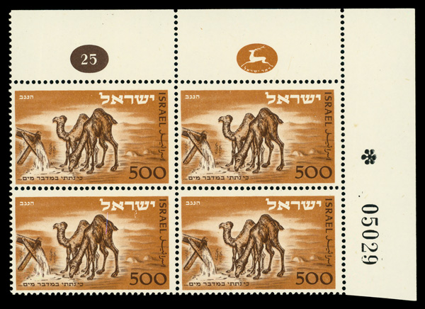7722 nhbl 25 image1950, 500p Negev Camel (Scott 25), plate block of 4, o.g., never hinged, Fine to Very Fine.