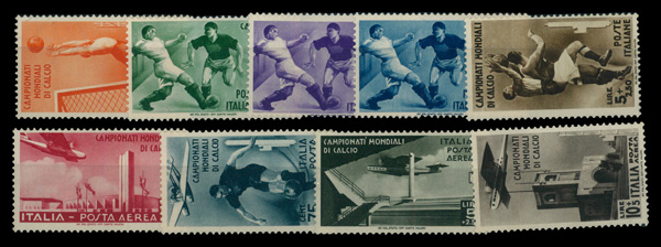 7744 og 324-328,C62-C65 image1934, 2nd Worlds Soccer Championship complete (Scott 324-328,C62-C65), complete set of singles, o.g., hinged, Fine to Very Fine.