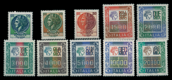 7759 nh 1288-1297 image1977-87, 120l - 20000l Italia complete (Scott 1288-1297), complete set of singles, o.g., never hinged.