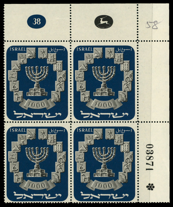 7723 nhbl 55 image1952, 1000p Menorah (Scott 55), plate block of 4, o.g., never hinged, Very Fine.