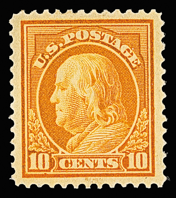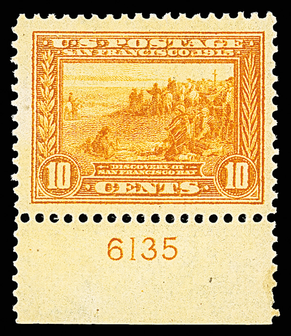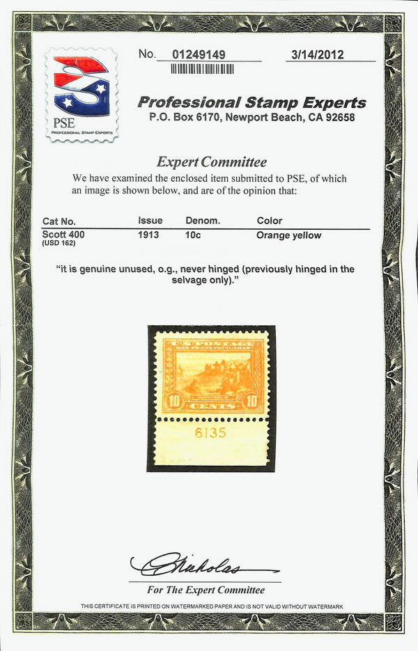 7063 nh 400 image1913, 10¢ Panama-Pacific, perf. 12, orange yellow (Scott 400), bottom margin plate number 6135 single, o.g., stamp never hinged, hinged in selvage only, attractively centered amid oversized margins, color slightly oxidized but design clear and bold, Very Fine, with 2012 P.S.E. certificate.