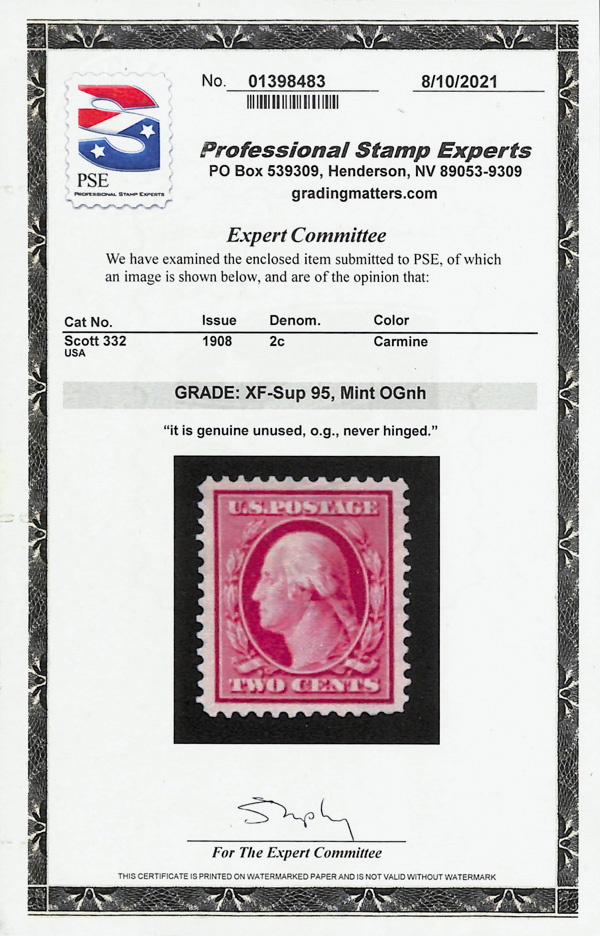 7048 nh 332 image1908, 2¢ carmine, D.L. watermark (Scott 332), symmetrically flawless, o.g., never hinged, Extremely Fine to Superb, with 2021 P.S.E. certificate graded XF-SUP 95.