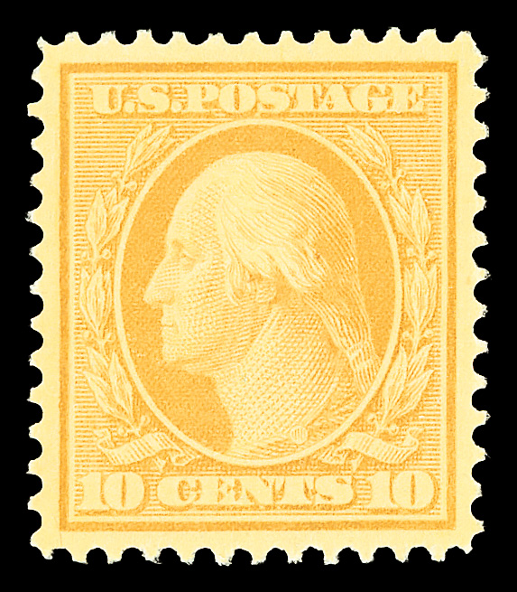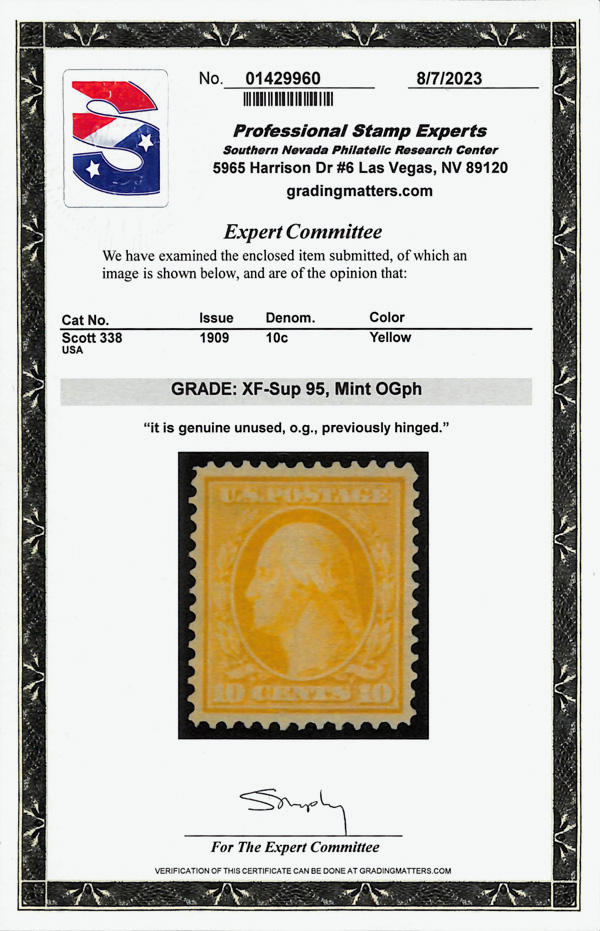 7049 og 338 image1909, 10¢ yellow, D.L. watermark (Scott 338), exceptionally framed example, o.g., previously hinged, Extremely Fine to Superb, with 2023 P.S.E. certificate graded XF-SUP 95.