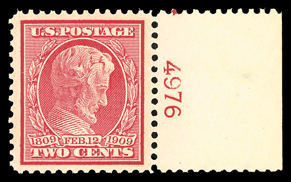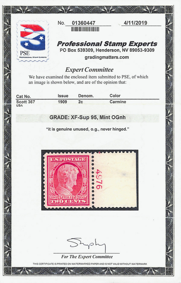 7051 nh 367 image1909, 2¢ Lincoln (Scott 367), single with plate number, premium centering quality, o.g., never hinged, Extremely Fine to Superb, with 2019 P.S.E. certificate graded XF-SUP 95.