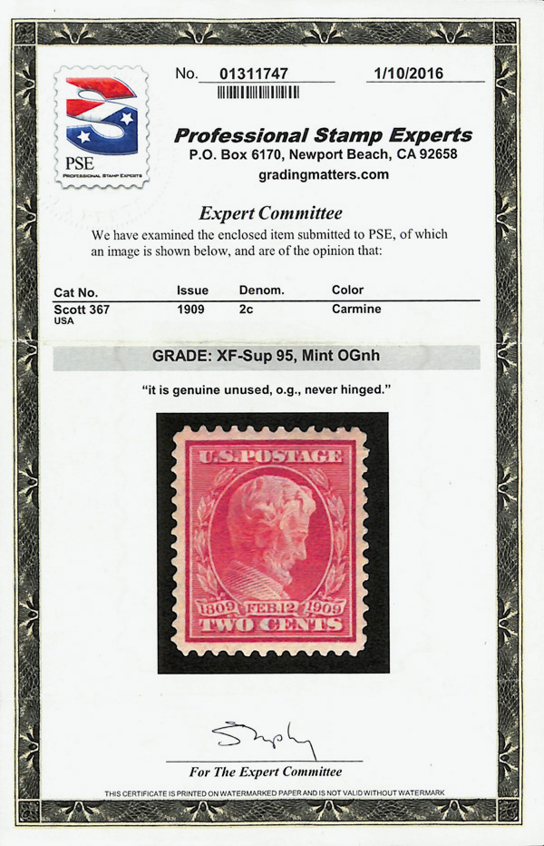 7052 nh 367 image1909, 2¢ Lincoln (Scott 367), well-proportioned margins, o.g., never hinged, Extremely Fine to Superb, with 2016 P.S.E. certificate graded XF-SUP 95.