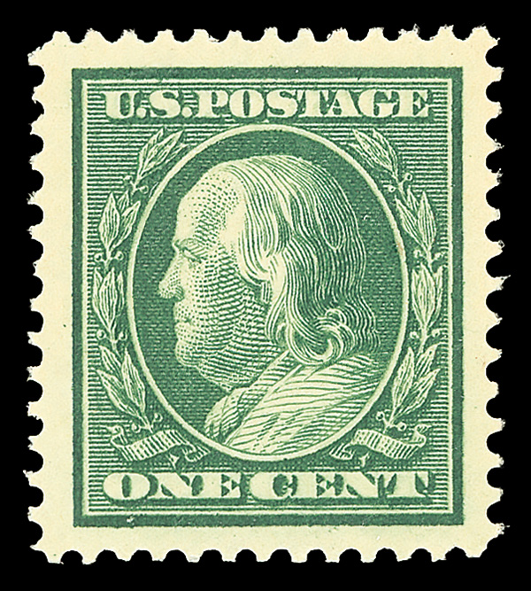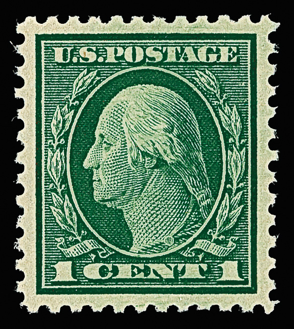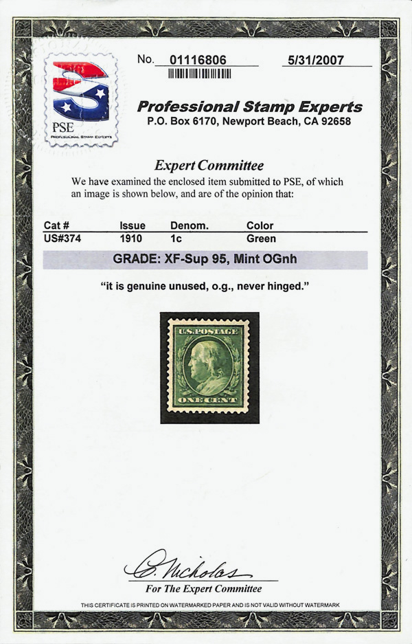 7057 nh 374 image1910, 1¢ green, S.L. watermark (Scott 374), handsome bold shade, o.g., never hinged, Extremely Fine to Superb, with 2007 P.S.E. certificate graded XF-SUP 95.