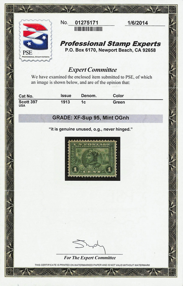 7060 nh 397 image1913, 1¢ Panama-Pacific, perf. 12 (Scott 397), brilliantly impressed strike, o.g., never hinged, Extremely Fine to Superb, with 2014 P.S.E. certificate graded XF-SUP 95.