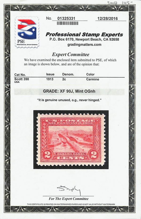 7062 nh 398 image1913, 2¢ Panama-Pacific, perf. 12 (Scott 398), beautifully framed design, o.g., never hinged, Extremely Fine, with 2016 P.S.E. certificate graded XF 90J.