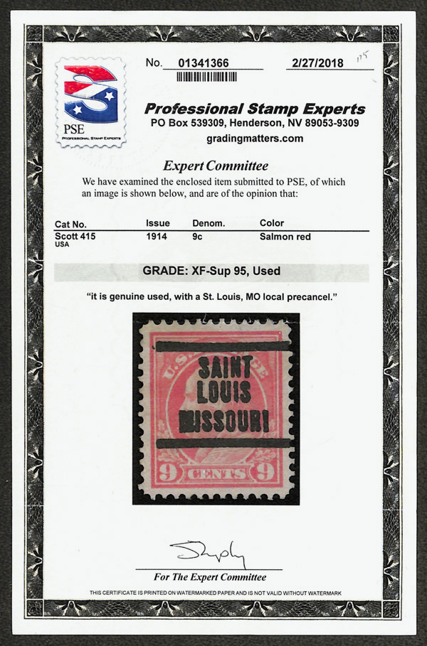 7065 O 415 image1914, 9¢ salmon red, S.L. watermark, perf. 12 (Scott 415), wide, even margins, Extremely Fine to Superb, with 2018 P.S.E. certificate graded XF-SUP 95.