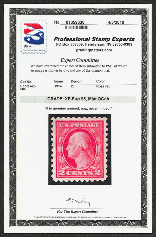 7069 nh 425 image1914, 2¢ rose red, type I, S.L. watermark, perf. 10 (Scott 425), handsome image clarity, o.g., never hinged, Extremely Fine to Superb, with 2019 P.S.E. certificate graded XF-SUP 95.
