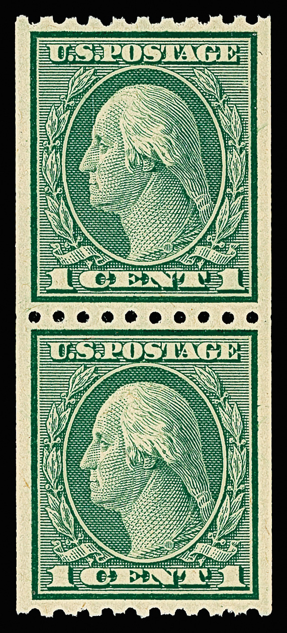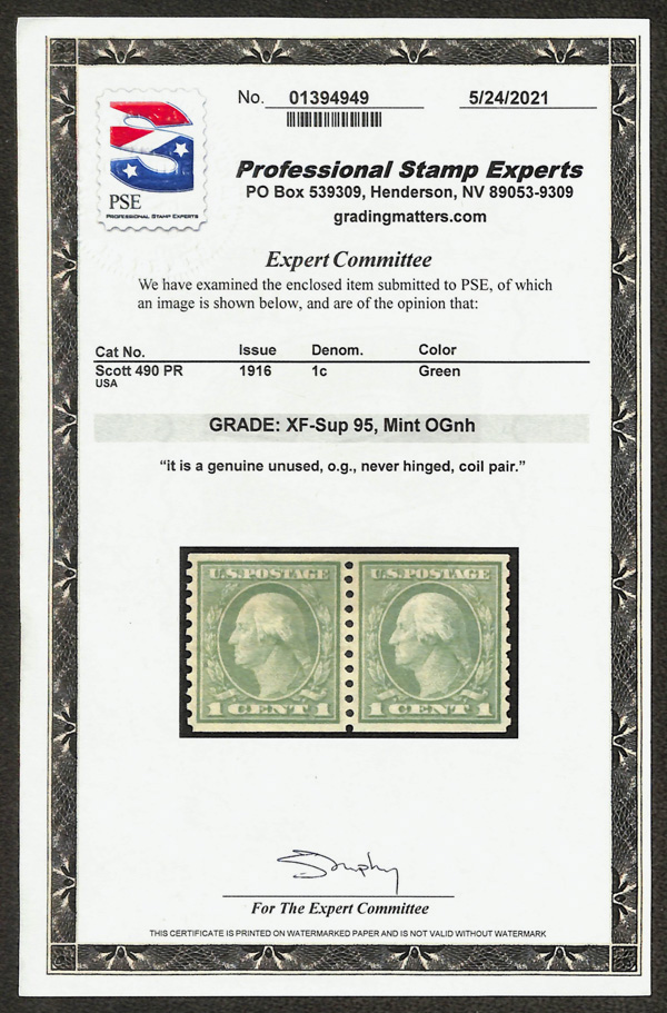 7077 nh 490 image1916, 1¢ green, unwatermarked, rotary press coil, perf. 10 vertically (Scott 490), pair, mathematically precise design, o.g., never hinged, Extremely Fine to Superb, with 2021 P.S.E. certificate graded XF-SUP 95.