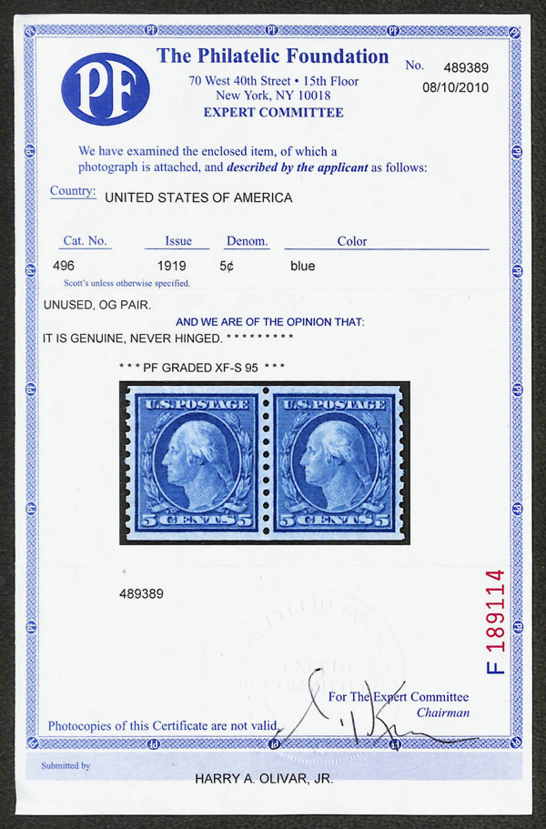 7078 nh 496 image1919, 5¢ blue, unwatermarked, rotary press coil, perf. 10 vertically (Scott 496), pair, vivid, deep impression, o.g., never hinged, Extremely Fine to Superb, with 2006 P.S.E. and 2010 P.F. certificates, each graded XF-SUP 95.