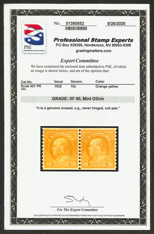 7079 nh 497 image1922, 10¢ orange yellow, unwatermarked, rotary press coil, perf. 10 vertically (Scott 497), pair, vivid, deep impression, o.g., never hinged, Extremely Fine, with 2020 P.S.E. certificate graded XF 90.