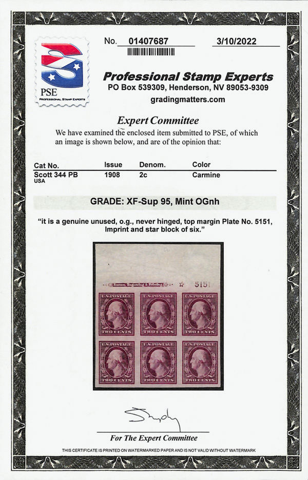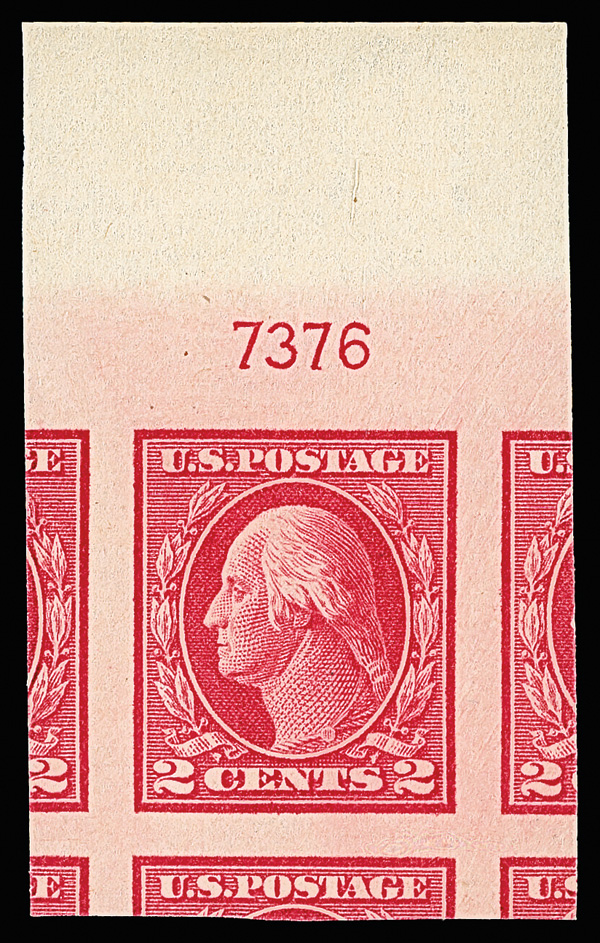 7050 nhbl 344 image1908, 2¢ carmine, D.L. watermark, imperf. (Scott 344), top margin plate block of 6 with star, deep rich color, ideally placed design, o.g., never hinged, Extremely Fine to Superb, with 2022 P.S.E. certificate graded XF-SUP 95.