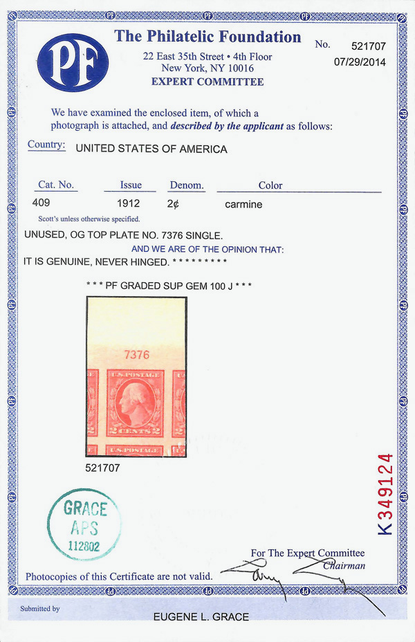 7064 nh 409 image1912, 2¢ carmine, type I, S.L. watermark, imperf. (Scott 409), top margin single with plate number, jumbo margins, rare, the SMQ doesn't currently list a jumbo premium for this issue, o.g., never hinged, Superb, with 2014 P.F. certificate graded GEM 100J.