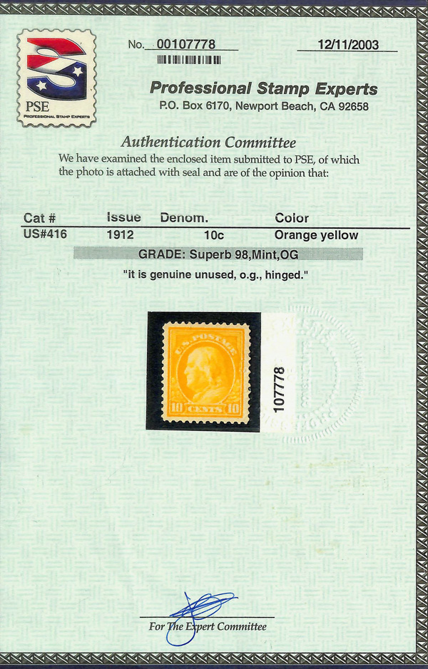 7066 og 416 image1912, 10¢ orange yellow, S.L. watermark, perf. 12 (Scott 416), well-struck, massive margins, o.g., hinged, Superb, with 2003 P.S.E. certificate graded SUP 98.