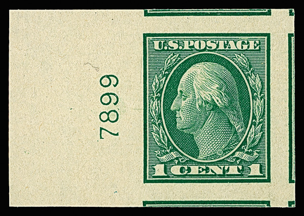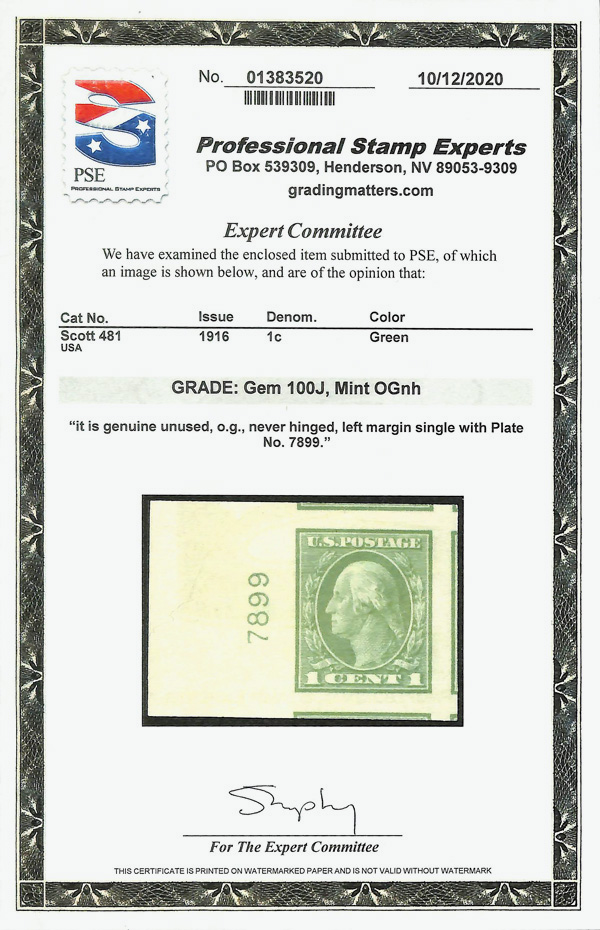 7074 nh 481 image1916, 1¢ green, unwatermarked, imperf. (Scott 481), left margin single with plate number, deep layout and sharp color, o.g., never hinged, with 2020 P.S.E. certificate graded GEM 100J.