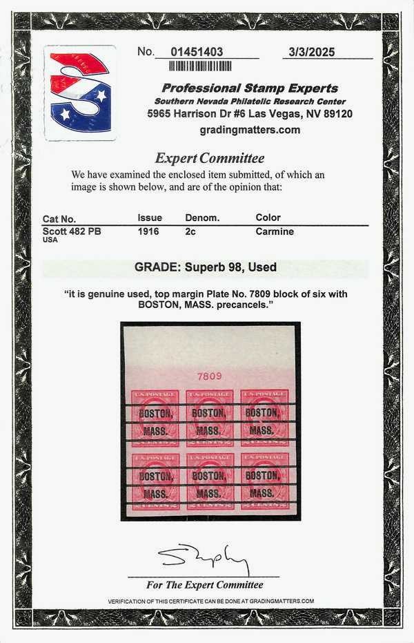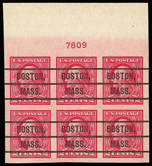 7075 Obl 482 image1916, 2¢ carmine, type I, unwatermarked, imperf. (Scott 482), top margin plate block of 6, well-centered, massive, Boston, Mass Precancel, Superb, with 2025 P.S.E. certificate graded SUP 98.