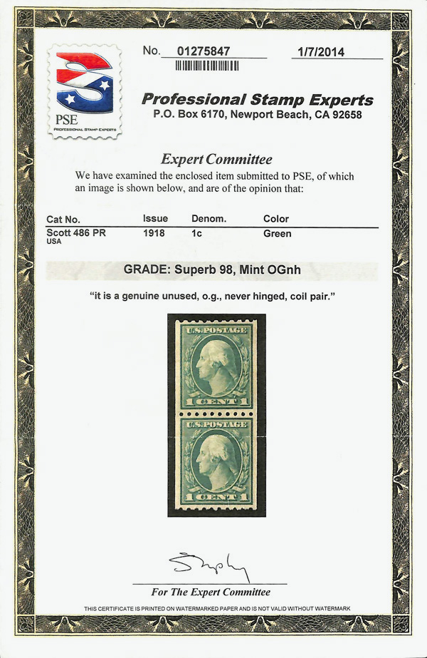 7076 nh 486 image1918, 1¢ green, unwatermarked, rotary press coil, perf. 10 horizontally (Scott 486), pair, evenly centered with vivid tone, o.g., never hinged, Superb, with 2014 P.S.E. certificate graded SUP 98.