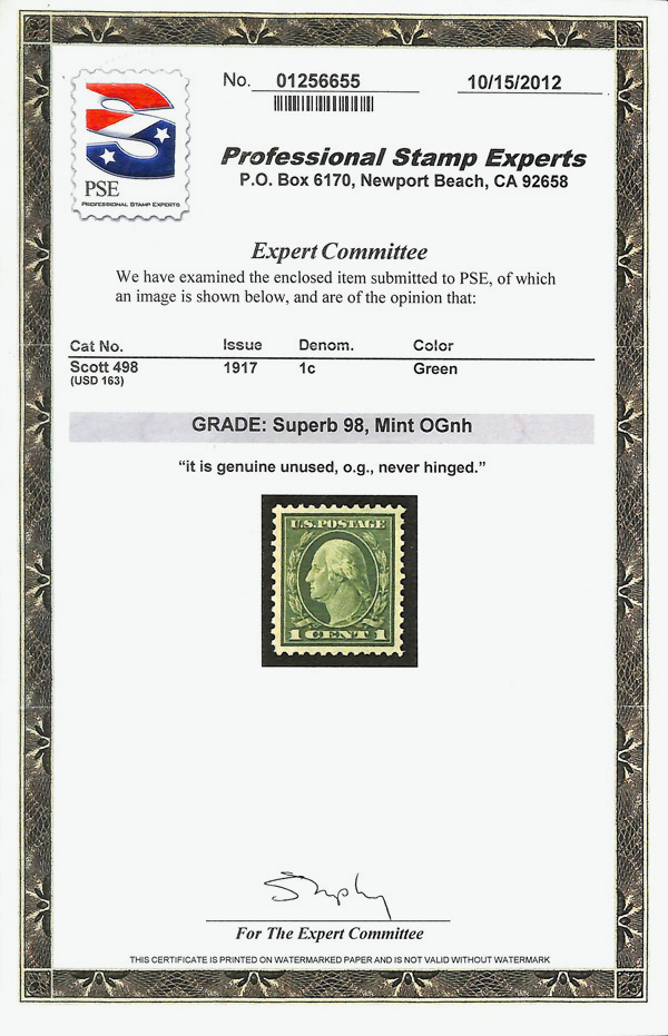 7080 nh 498 image1917, 1¢ green, perf. 11 (Scott 498), deep color and balanced, o.g., never hinged, Superb, with 2012 P.S.E. certificate graded SUP 98.