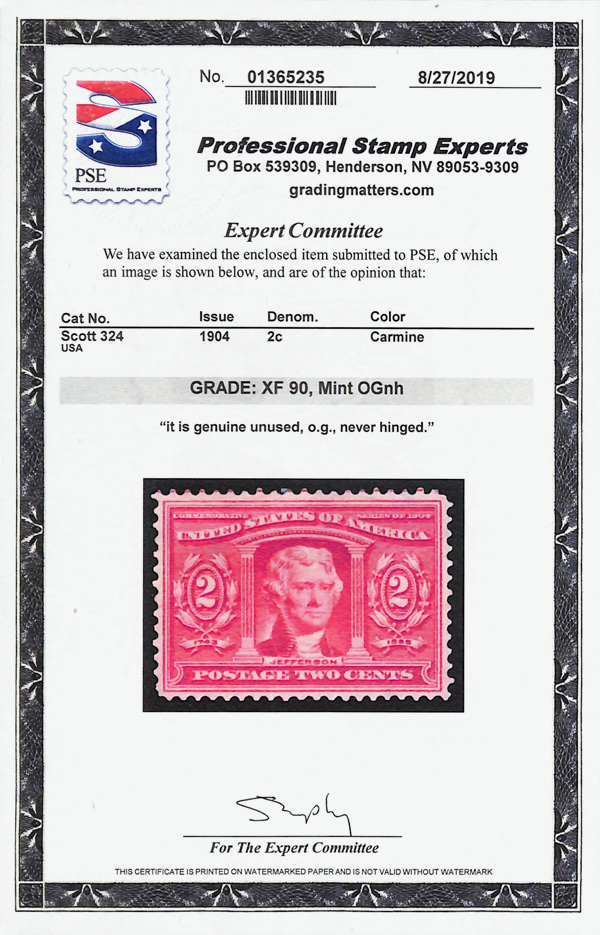 7044 nh 324 image1904, 2¢ Louisiana Purchase (Scott 324), margins evenly proportioned, o.g., never hinged, Extremely Fine, with 2019 P.S.E. certificate graded XF 90.