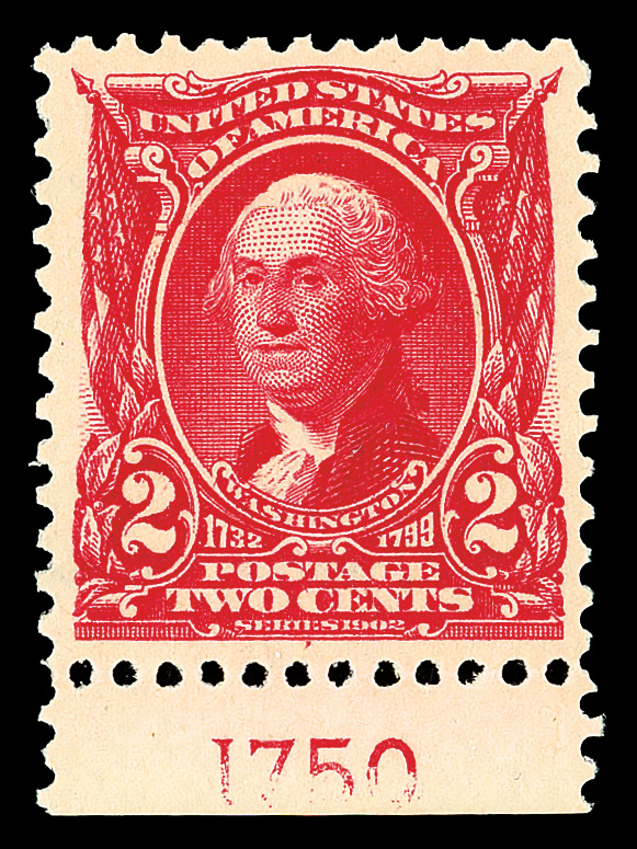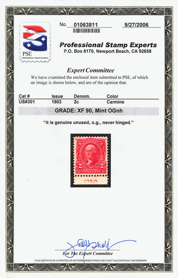 7041 nh 301 image1903, 2¢ carmine (Scott 301), single with plate number, near-mathematical alignment, o.g., never hinged, Extremely Fine, with 2006 P.S.E. certificate graded XF 90.
